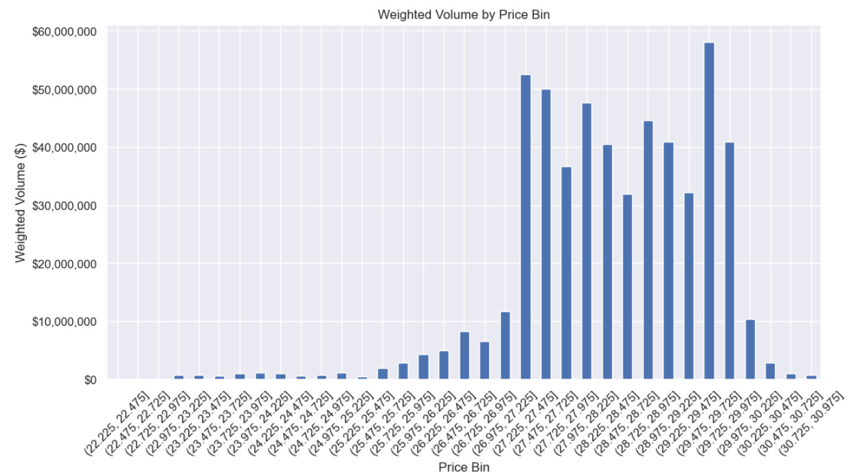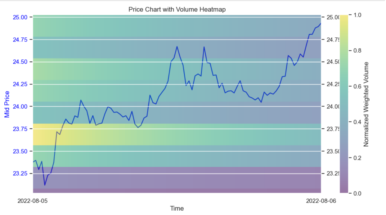 We then can use the below code to calculate the exponentially decayed volume traded at each level, and plot it as a histogram:
