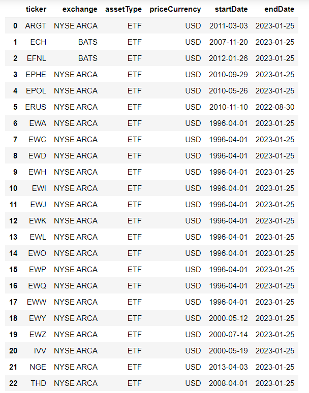 supported_tickers = supported_tickers[supported_tickers.ticker.isin(country_tickers)].reset_index(drop=True);Here is a quick print-out of what the supported_tickers table looked like after (end dates are a month old because I didn’t pull this data today)