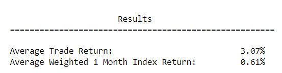 print('Average Weighted 1 Month Index Return: {:.2f}%'.format(avg_index_return))Results