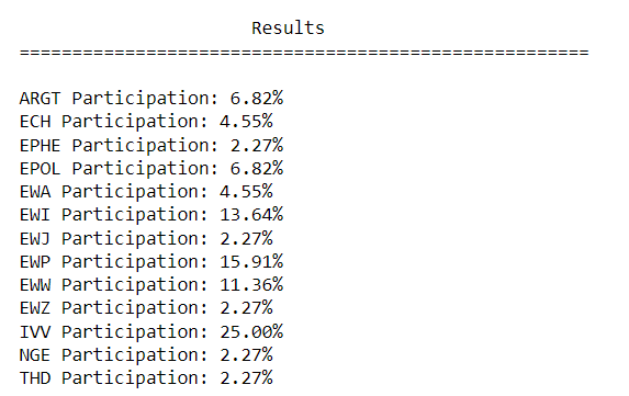total_count = len(results_table)Finally, we compute our average monthly returns by ETF and save it alongside the % of trades that each ETF was used for.
