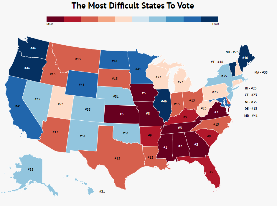 If you can lower the turnout of younger people, you favor the Republicans. You can also exploit the fact that lower-income people favor Democrats and increase the cost of voting (mostly time cost) through adding extra “background checks” etc. This is why the map of hard vs easy to vote states lines up nicely with red vs blue states.
