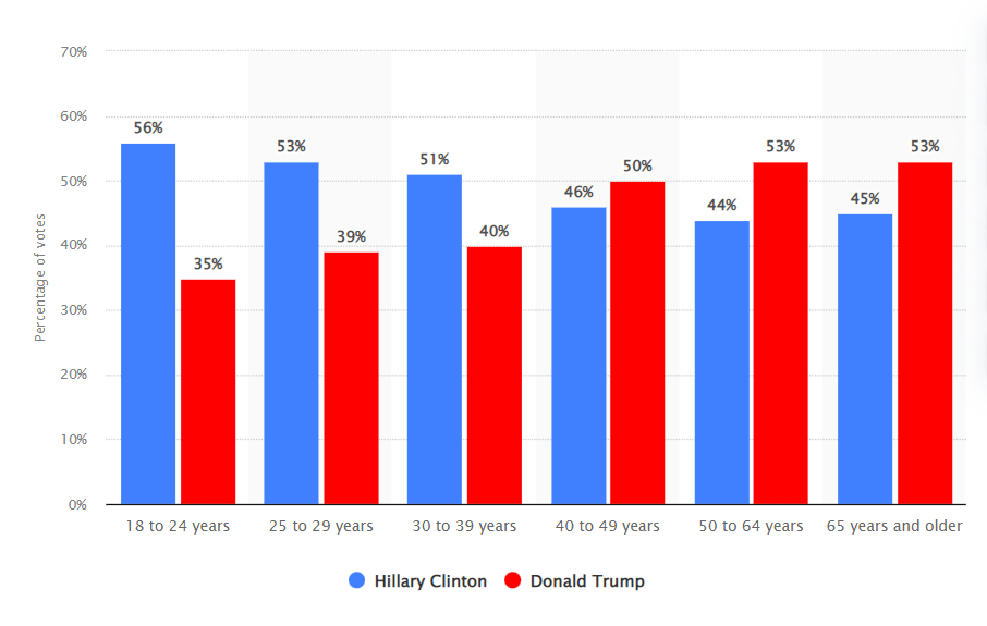 Using the below table from the 2016 election, we can see that there is a clear relationship between age and political preference. I’m using 2016 since it was a lot closer to 50/50 (by popular vote) than the 2020 election. This makes our results more generalizable.