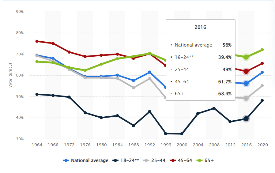 18-29-year-olds are also roughly similar in size to the population of people over 65 in the US. We will ignore the middle age ranges as these are closer to 50/50, and also, I am lazy. As a rough figure, we will use 42% as the turnout for 18-29-year-olds, and 68% for 65+-year-olds.