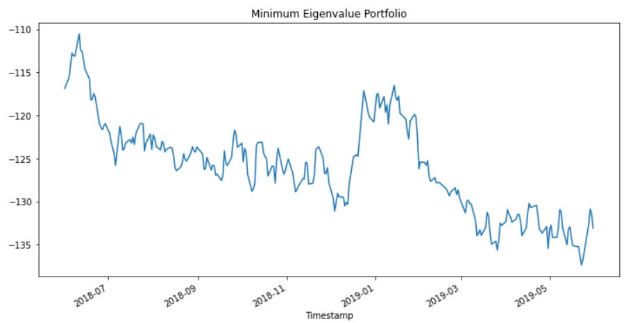 Finally, we sort our eigenvalues and eigenvectors. Our smallest eigenvalue's corresponding eigenvector can be dot multiplied with the inverse square root of our covariance matrix “rho_inv_sqrt” to give us the weights that minimize our portmanteau statistic. This is the weights for our mean-reverting portfolio. We can do the opposite of this to get a momentum portfolio, although, in my experience momentum portfolios are best formed using other methods and approaches not covered in this article.