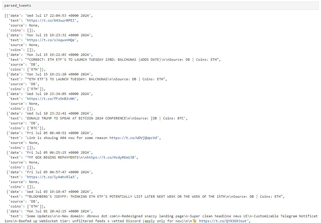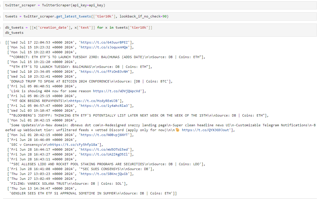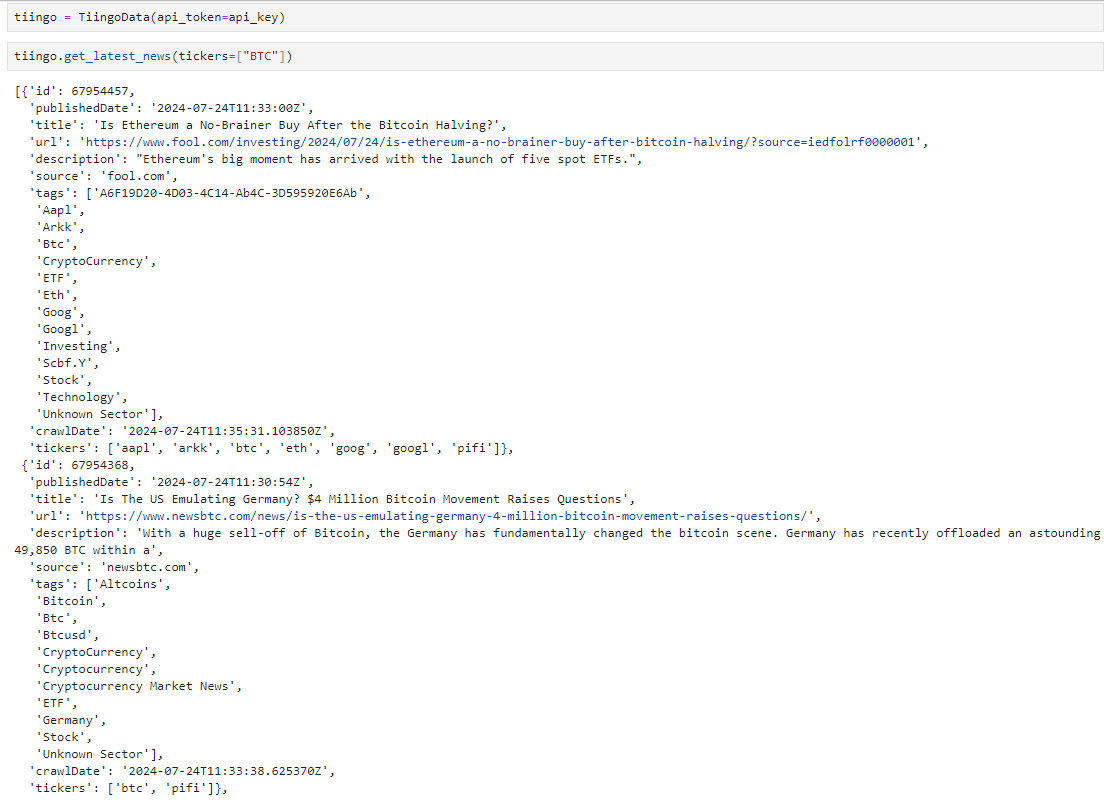 return response.json()As we can see below, getting the latest news involving BTC is relatively easy: