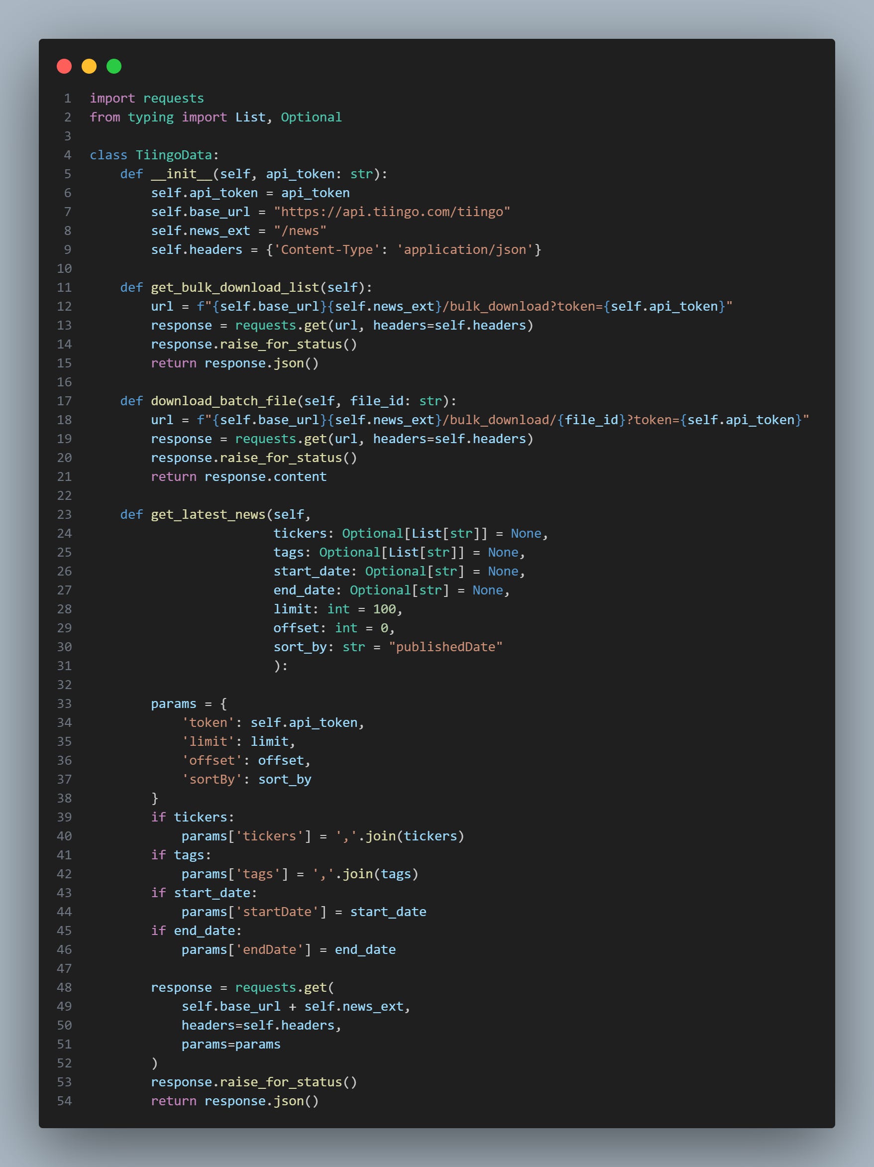 In addition to being absurdly cheap at only $30 a month, Tiingo also offers an excellent API for news data. I’ve coded up their API into a Python class for us to use, and we’ll be using this for all of our scraping: