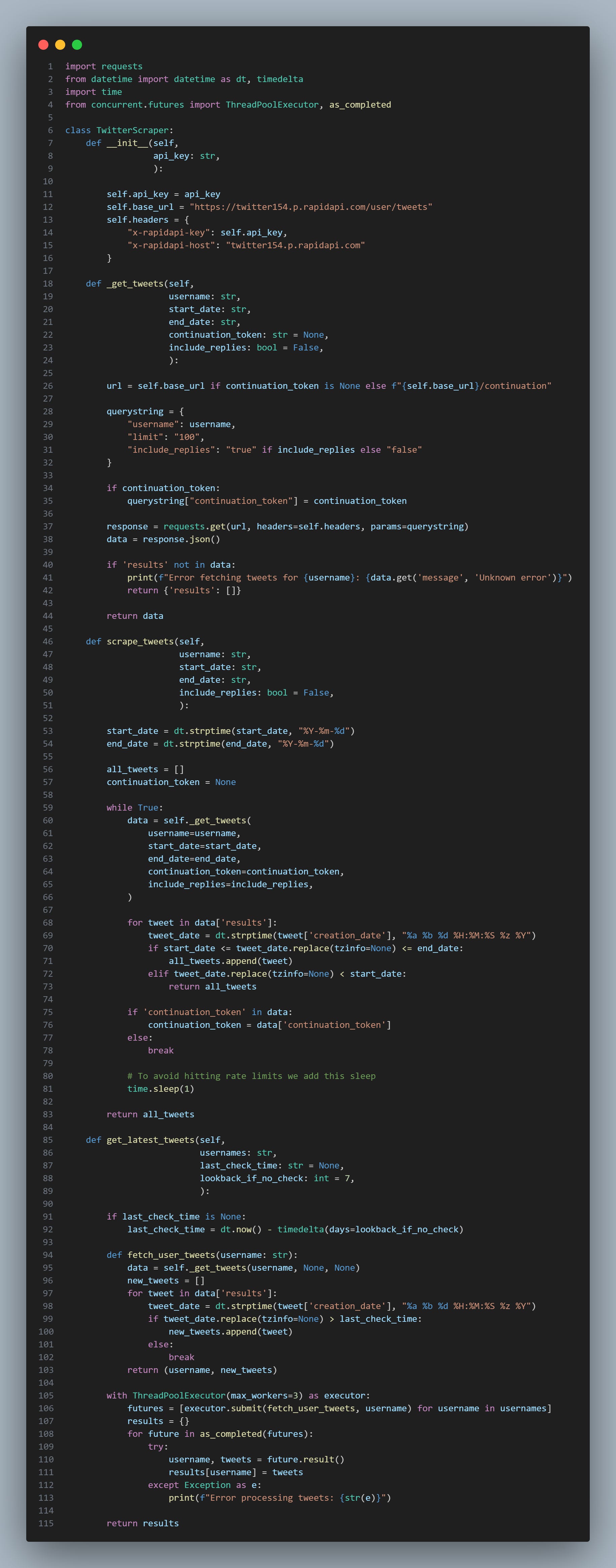 Using Twitter normally requires us to use the Twitter API, and that’s still an option if we are a particularly well-funded enterprise and need the lowest latency possible. However, markets tend not to react instantly to Twitter news, so a second of latency isn’t much of a problem.