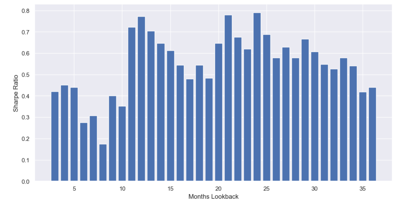 Now that we have our “momentum strategy” to generate Sharpe ratios for, we can run some simulations. I backtested this strategy with the lookback (months) parameter set to all values between 3-36 and recorded the Sharpe ratio. This is the bar chart: