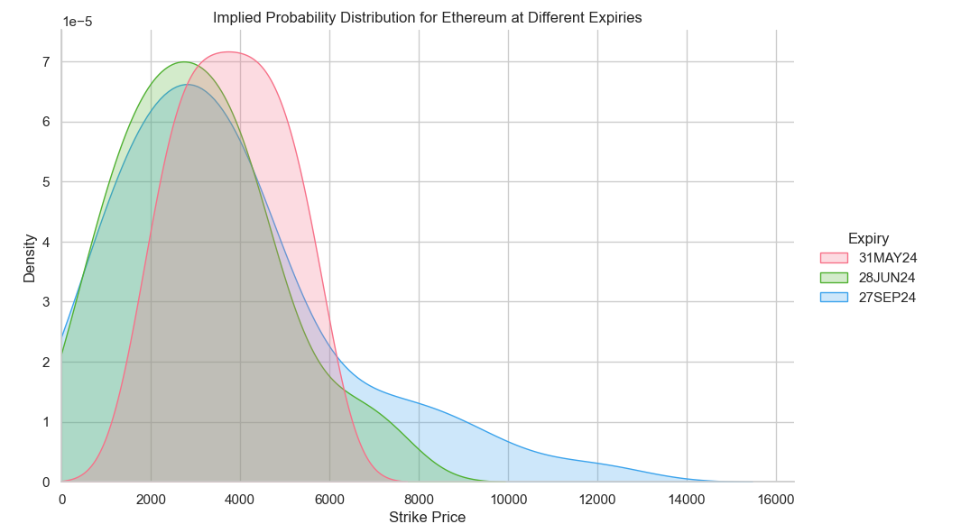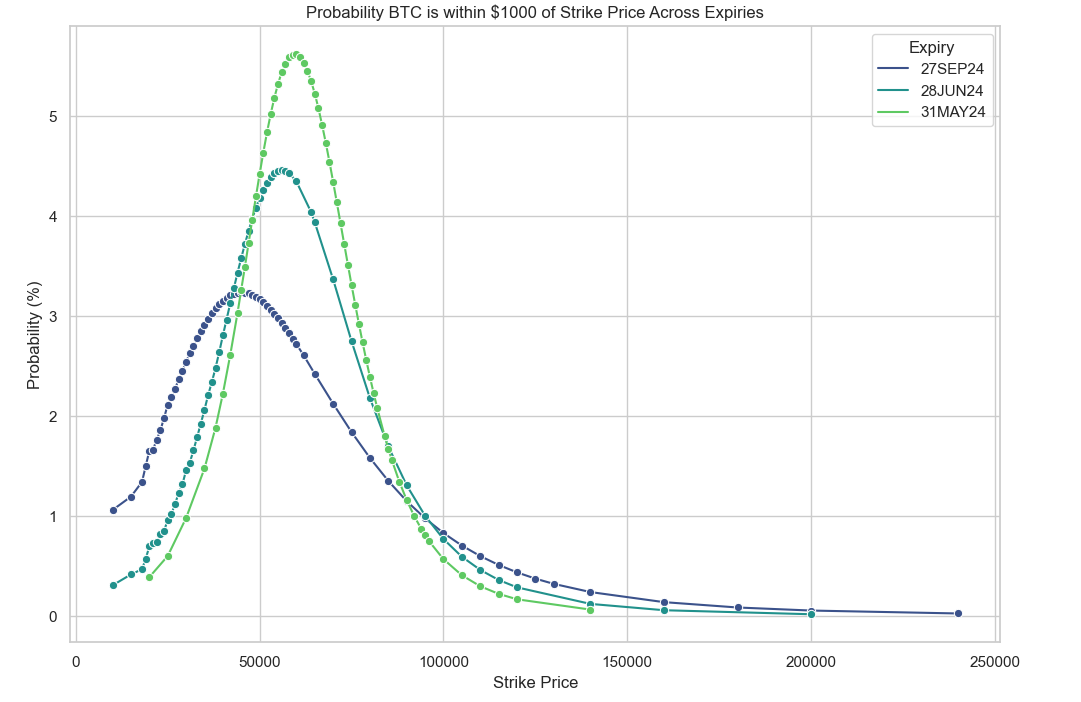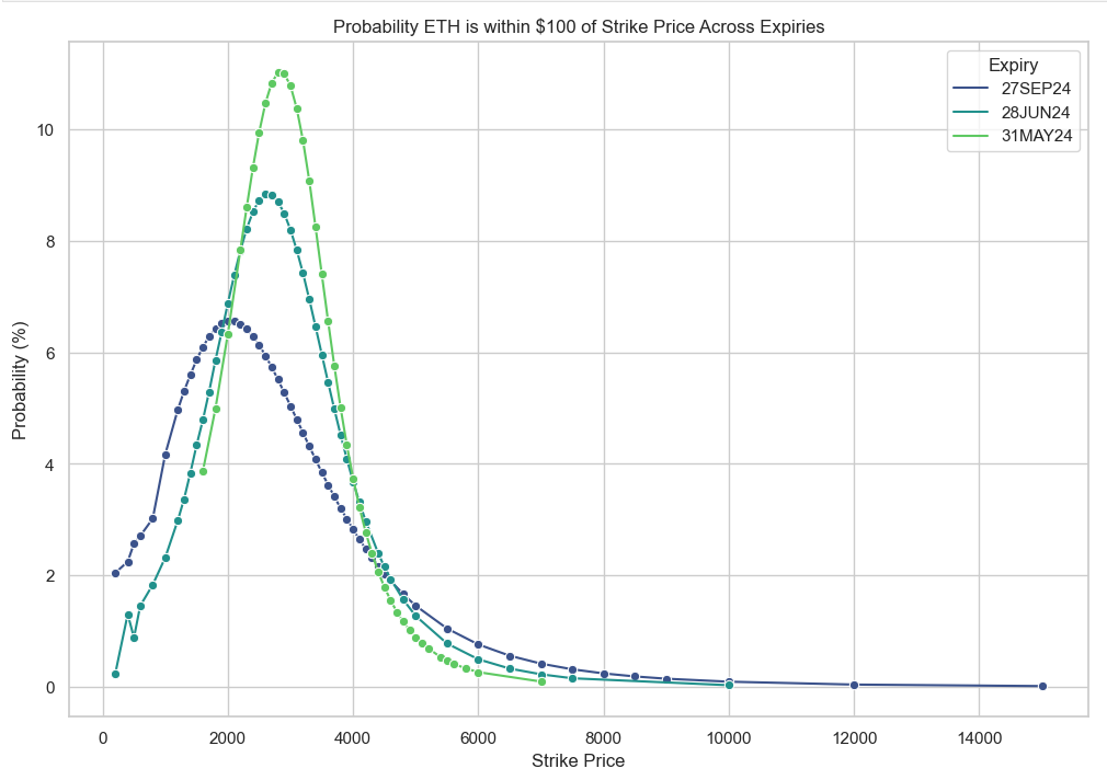 We do a few modifications to this as we then also look at the probability that the price will end up within $100 and $1000 of each strike (for ETH and BTC respectively), but I will touch on this in a later article.