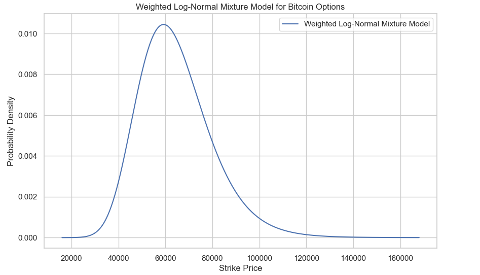 plt.title('Weighted Log-Normal Mixture Model for Bitcoin Options')