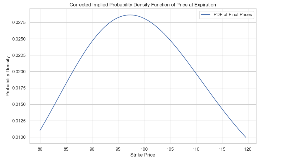 plt.title('Corrected Implied Probability Density Function of Price at Expiration')